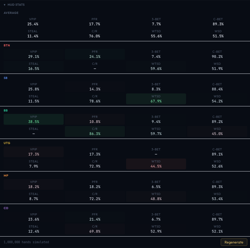 The HUD (Heads-Up Display) stats panel simulates one million hands from the solved strategy and computes standard poker statistics for each position. These are the same stats you would see in a poker tracking program like PokerTracker or Hold'em Manager, but derived from the GTO solution rather than from actual play.