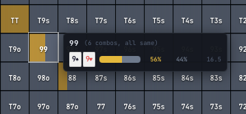 For preflop nodes where all combos of a hand class share the same strategy, the tooltip shows a single representative line with a note like "(6 combos, all same)".