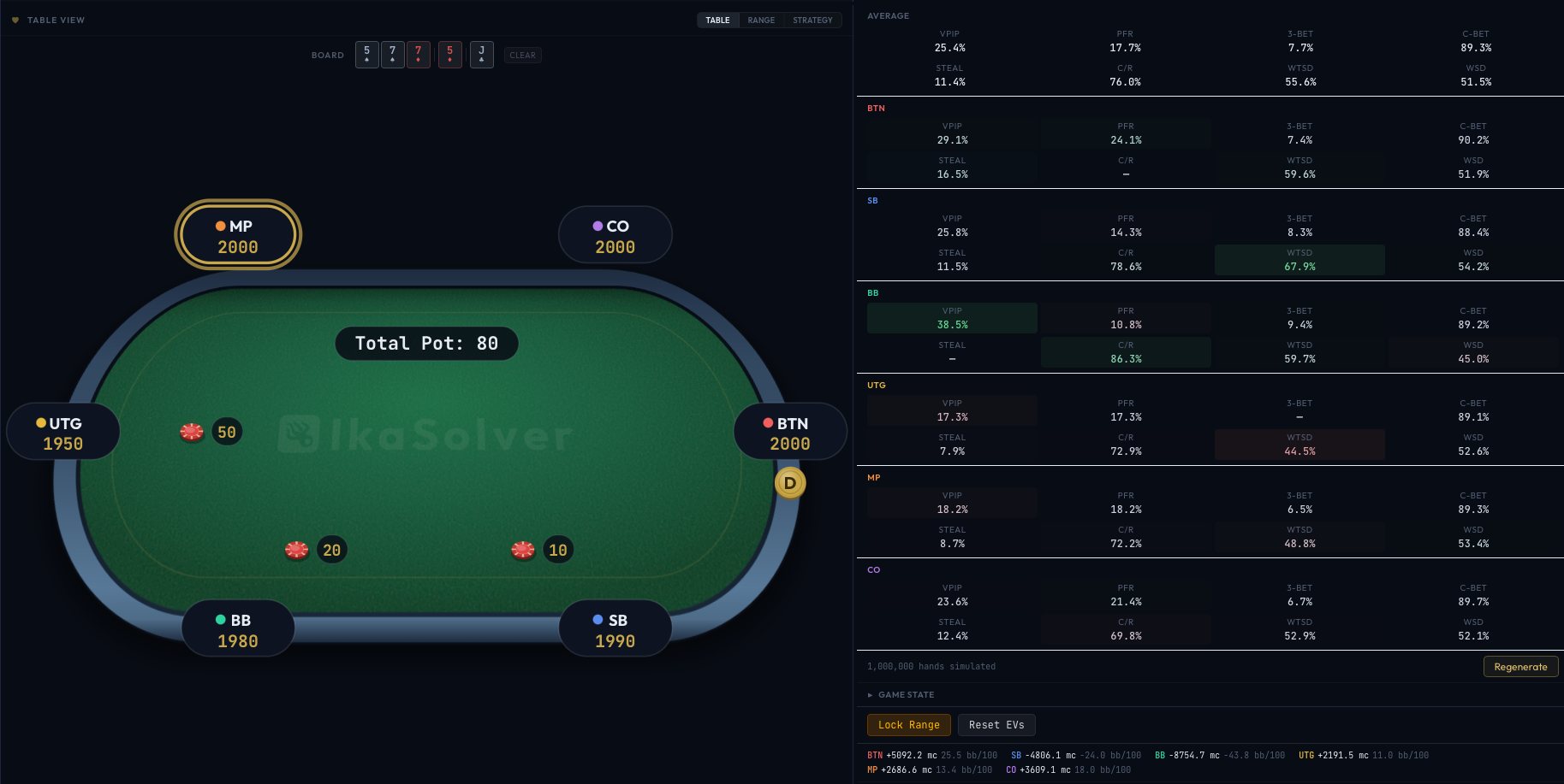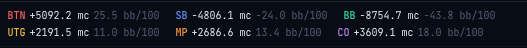 BTN GTO 142.3 → Locked 138.1 (-4.2 mc) -0.2 bb/100This shows the GTO EV, the locked (exploitative) EV, and the difference - making it easy to see how much EV your deviation costs or gains at each position.