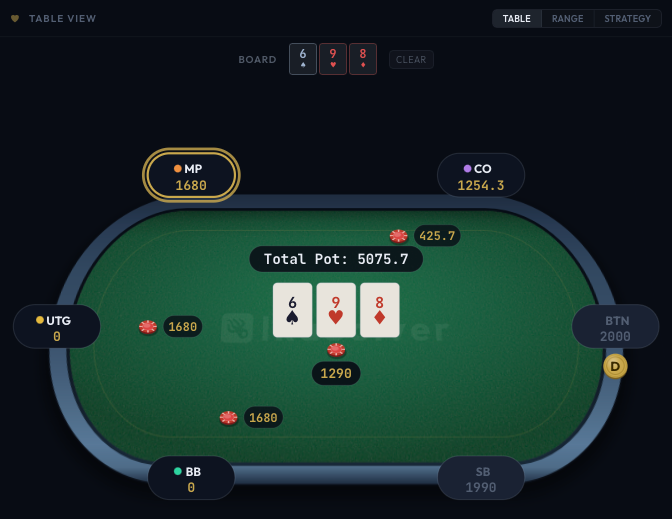 - Player positions - Each seat shows the position name (BTN, SB, BB, UTG, etc.) with color coding.