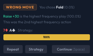 - Repeat - Deals a new hand with the same cards and board (a "repeat spot"), so you can try the decision again. This button only appears when a snapshot of the spot is available.