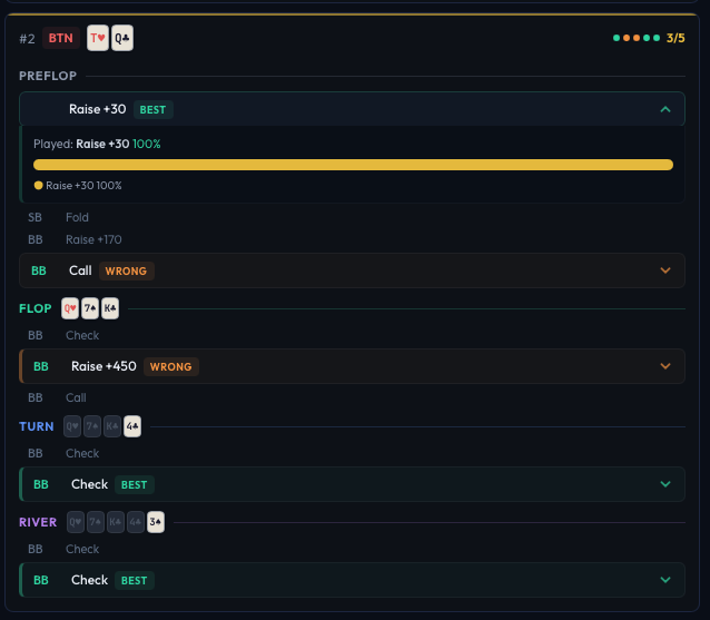 - Best action - When your choice wasn't the best, this shows the highest-frequency action and its percentage. For example: "Call is the highest frequency play (52.1%)".
