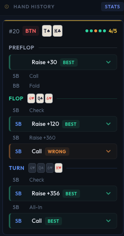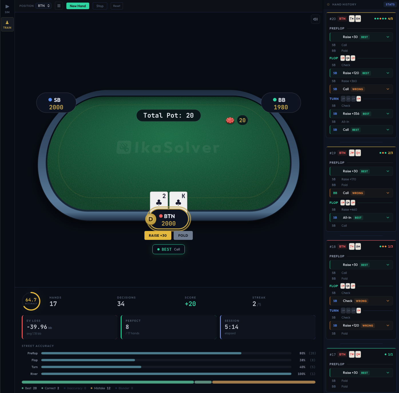 - Session stats at the bottom - live accuracy ring, score, streak, EV loss, per-street and per-position accuracy bars. See stats and history.