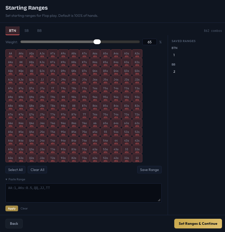 - 100% ranges: If all players have 100% on all hands, the dialog shows an info banner and offers a Skip (100% Ranges) button to continue without setting any range restrictions.